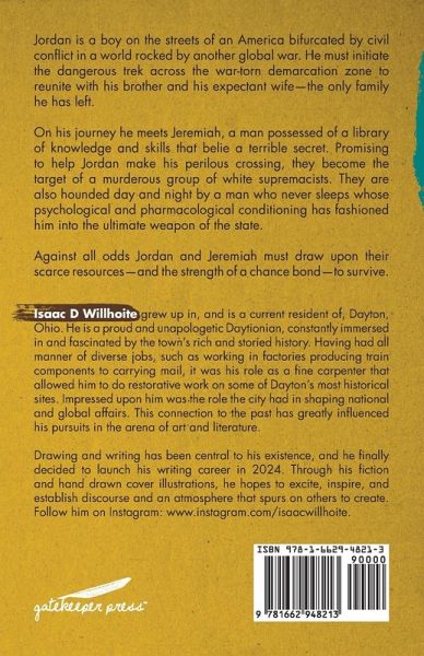 Jordan is a boy on the streets of an America bifurcated by civil conflict, in a world rocked by another global war. He must initiate the dangerous trek across the war torn demarcation zone to reunite with his brother and his expectant wife: the only family he has left. On his journey he meets Jeremiah. A man posessed of a library of knowledge and skill that belies a terrible secret. Promising to help Jordan make his perilous crossing and find his brother, they become the target of a murderous group of white supremacists. They are also hounded day and night by a man who never sleeps, and whos psychological and pharmacological conditioning has fashioned him into the ultimate weapon of the state. Against all odds, they must draw upon their scarce resources and the strength of the chance bond to survive.