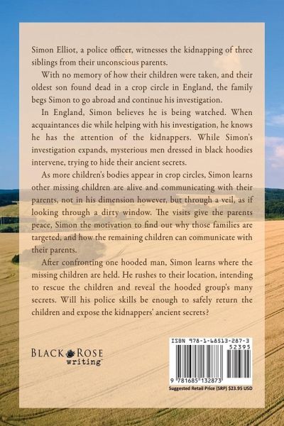"Buckle up and put on your tinfoil hat for this journey, it's a masterfully-written five-star adventure full of fun, fear, and unexpected twists." -Bill Schweitzer, Doves in a Tempest Simon Elliot, a police officer, witnesses the kidnapping of three siblings from their unconscious parents. With no memory of how their children were taken, and their oldest son found dead in a crop circle in England, the family begs Simon to go abroad and continue his investigation. In England, Simon believes he is being watched. When acquaintances die while helping with his investigation, he knows he has the attention of the kidnappers. While Simon's investigation expands, mysterious men dressed in black hoodies intervene, trying to hide their ancient secrets. As more children's bodies appear in crop circles, Simon learns other missing children are alive and communicating with their parents, not in his dimension however, but through a veil, as if looking through a dirty window. The visits give the parents peace, Simon the motivation to find out why those families are targeted, and how the remaining children can communicate with their parents. After confronting one hooded man, Simon learns where the missing children are held. He rushes to their location, intending to rescue the children and reveal the hooded group's many secrets. Will his police skills be enough to safely return the children and expose the kidnappers' ancient secrets?