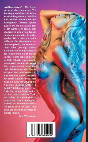 "Wetten, dass..?" Wer kennt sie nicht, die einzigartige ZDF-Samstagabendshow, die knapp 35 Jahre lang die Welt erfüllte. Spektakuläre Wetten wurden durchgeführt. Wetten spielen auch in meinem Leben eine große Rolle. Ich wette sehr gerne! Weil ich dadurch schon viele Frauen rumbekommen habe. In vorliegendem Werk habe ich meine heißesten Sex-Geschichten zusammengestellt, die ich mir erspielt habe. "Besiegt, Erobert & Geliebt" lautet das Motto. In der Regel bekomme ich Frauen so. Über 1.500 habe ich bereits im Bett gehabt. Einige von ihnen musste ich aber ein wenig überzeugen, es mit mir zu tun. Und hier kommen die Wetten ins Spiel. Man muss Frauen nur eine reizvolle Wette anbieten, mit einem inspirierenden Gewinn für sie. Man muss sie auch am Ego packen. Sieben geniale Highlights warten auf dich. Sie sollen dich inspirieren und dir zeigen, welche Tricks mir halfen, die Nuss doch noch zu knacken.