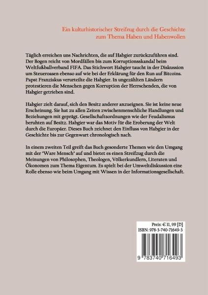 Täglich erreichen uns Nachrichten, die auf Habgier zurückzuführen sind. Der Bogen reicht von Mordfällen bis zum Korruptionsskandal beim Weltfußballverband FIFA. Das Stichwort Habgier taucht in der Diskussion um Steueroasen ebenso auf wie bei der Erklärung für den Runs auf Bitcoins. Papst Franziskus verurteilte die Habgier. In ungezählten Ländern protestieren die Menschen gegen Korruption der Herrschenden, die von Habgier getrieben sind.Habgier zielt darauf, sich den Besitz anderer anzueignen. Sie ist keine neue Erscheinung. Sie hat zu allen Zeiten zwischenmenschliche Handlungen und Beziehungen mit geprägt. Gesellschaftsordnungen wie der Feudalismus beruhten auf Besitz. Habgier war das Motiv für die Eroberung der Welt durch die Europäer. Dieses Buch zeichnet den Einfluss von Habgier in der Geschichte bis zur Gegenwart chronologisch nach. In einem zweiten Teil greift das Buch gesonderte Themen wie den Umgang mit der "Ware Mensch" auf und bietet es einen Streifzug durch die Meinungen von Philosophen, Theologen, Völkerkundlern, Literaten und Ökonomen zum Thema Eigentum. Es spielt bei der Umweltdiskussion eine Rolle ebenso wie beim Umgang mit Wissen in der Informationsgesellschaft.