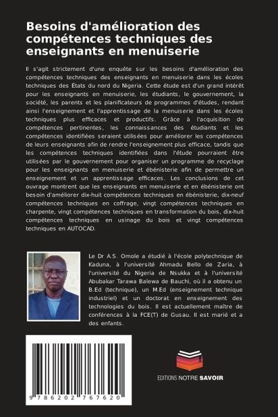 Il s'agit strictement d'une enquête sur les besoins d'amélioration des compétences techniques des enseignants en menuiserie dans les écoles techniques des États du nord du Nigeria. Cette étude est d'un grand intérêt pour les enseignants en menuiserie, les étudiants, le gouvernement, la société, les parents et les planificateurs de programmes d'études, rendant ainsi l'enseignement et l'apprentissage de la menuiserie dans les écoles techniques plus efficaces et productifs. Grâce à l'acquisition de compétences pertinentes, les connaissances des étudiants et les compétences identifiées seraient utilisées pour améliorer les compétences de leurs enseignants afin de rendre l'enseignement plus efficace, tandis que les compétences techniques identifiées dans l'étude pourraient être utilisées par le gouvernement pour organiser un programme de recyclage pour les enseignants en menuiserie et ébénisterie afin de permettre un enseignement et un apprentissage efficaces. Les conclusions de cet ouvrage montrent que les enseignants en menuiserie et en ébénisterie ont besoin d'améliorer dix-huit compétences techniques en ébénisterie, dix-neuf compétences techniques en coffrage, vingt compétences techniques en charpente, vingt compétences techniques en transformation du bois, dix-huit compétences techniques en usinage du bois et vingt compétences techniques en AUTOCAD.