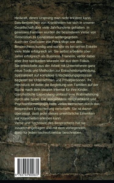 Petra Moje, die neben ihrer langjährigen Arbeit als Business-Trainerin und Coach auch die Heilpraktikerprüfung und einen Bachelor in Psychoinformatiologie abgelegt hat, konzentriert sich auf die Lösung von komplexen privaten & beruflichen Entscheidungsprozessen. Seit Beginn ihrer Selbständigkeit vor rund 30 Jahren schwang immer schon der Ansatz einer umfassenden Sichtweise mit, in ihrem aktuellen Buch legt sie einen spirituellen Schwerpunkt. Schon als kleines Mädchen hatte ihr Großvater bei kleinen Verletzungen und Krankheiten das Besprechen erfolgreich angewendet. Im Laufe ihrer Arbeit mit den uralten, überlieferten Versen stellte sie fest, dass die Sprüche, die in den einzelnen Familien weitergegeben werden, sehr ähnlich sind. Um diese - bisher nur von Generation zu Generation unter Verwandten übermittelten - Informationen um die Heilkraft des gesprochenen Wortes in einem rituellen Umfeld einer breiten interessierten Öffentlichkeit zugänglich zu machen, verfasste sie nun einen leicht verständlichen Ratgeber. Die Autorin selbst bespricht auch heute noch Menschen, die sich persönlich an sie wenden. Ihr beruflicher Schwerpunkt liegt in der Begleitung von komplexen Entscheidungsprozessen: Wie Sie das beste Internat für Ihre Kinder auswählen. Und für alle, die andere komplexe Entscheidungen auf den Punkt treffen wollen - beruflich und privat. Mehr Informationen über ihre EntscheidungsCoachings, Internatsberatungen, Vorträge, Seminare und Veröffentlichungen unter www.petramoje.de Petra Moje Komplexe Entscheidungen. Auf den Punkt. Jetzt. Internetauftritte: Facebook-Unternehmensseite https://www.facebook.com/PetraMoje.de/ Instagram https://www.instagram.com/petra_moje Youtube https://www.youtube.com/channel/UChjsgamQLGovgLZoipSdK-Q Elopage https://elopage.com/s/PetraMoje Pinterest https://https://pinterest.de/petramoje1