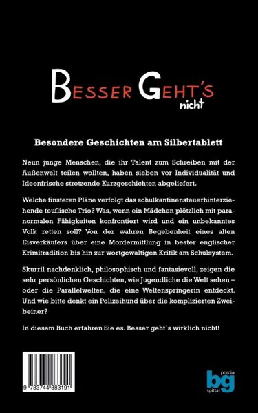 Neun junge Menschen, die ihr Talent zum Schreiben mit der Außenwelt teilen wollten, haben sieben vor Individualität und Ideenfrische strotzende Kurzgeschichten abgeliefert. Welche finsteren Pläne verfolgt das schulkantinensteuerhinterziehende teuflische Trio? Was, wenn ein Mädchen plötzlich mit paranormalen Fähigkeiten konfrontiert wird und ein unbekanntes Volk retten soll? Von der wahren Begebenheit eines alten Eisverkäufers über eine Mordermittlung in bester englischer Krimitradition bis hin zur wortgewaltigen Kritik am Schulsystem. Skurril nachdenklich, philosophisch und fantasievoll zeigen die sehr persönlichen Geschichten, wie Jugendliche die Welt sehen - oder die Parallelwelten, die eine Weltenspringerin entdeckt. Und wie bitte denkt ein Polizeihund über die komplizierten Zweibeiner? In diesem Buch erfahren Sie es. Besser geht's wirklich nicht!Die Kurzgeschichten entstanden, begleitet von der Autorin und Schreibberaterin Dr. in Alexandra Bleyer, im Zuge einer kreativen Schreibwerkstätte am Bundesgymnasium Porcia in Spittal an der Drau/Kärnten.
