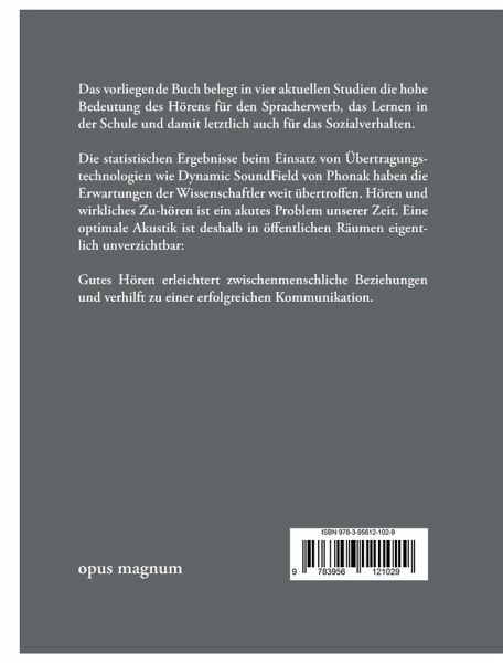 Das vorliegende Buch belegt in vier aktuellen Studien die hohe Bedeutung des Hörens für den Spracherwerb, das Lernen in der Schule und damit letztlich auch für das Sozialverhalten. Die statistischen Ergebnisse beim Einsatz von Übertragungs- technologien wie Dynamic SoundField von Phonak haben die Erwartungen der Wissenschaftler weit übertroffen. Hören und wirkliches Zu-hören ist ein akutes Problem unserer Zeit. Eine optimale Akustik ist deshalb in öffentlichen Räumen eigent- lich unverzichtbar: Gutes Hören erleichtert zwischenmenschliche Beziehungen und verhilft zu einer erfolgreichen Kommunikation.