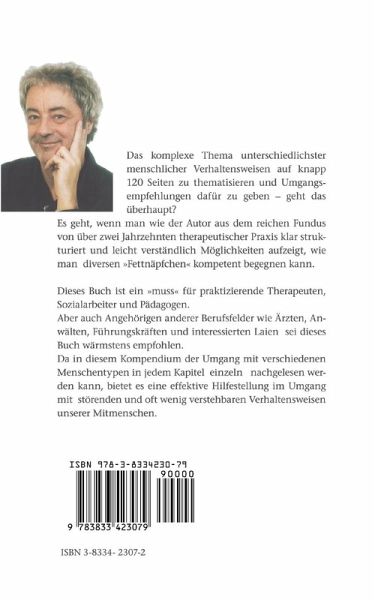 Das komplexe Thema unterschiedlichster menschlicher Verhaltensweisen auf knapp 120 Seiten zu thematisieren und Umgangsempfehlungen dafür zu geben - geht das überhaupt?Es geht, wenn man wie der Autor aus dem reichen Fundus von über zwei Jahrzehnten therapeutischer Praxis klar strukturiert und leicht verständlich Möglichkeiten aufzeigt, wie man diverse "Fettnäpfchen" kompetent begegnen kann. Dieses Buch ist ein "muss" für jeden praktizierenden Therapeuten, Sozialarbeiter und Pädagogen.Aber auch Angehörige anderer Berufsfelder wie Ärzten, Anwälten, Führungskräften und interessierten Laien sei dieses Buch wärmstens empfohlen. Da in diesem Kompendium der Umgang mit verschiedenen Menschentypen in jedem Kapitel einzeln nachgelesen werden kann, bietet es eine effektive Hilfestellung im Umgang mit störenden und oft wenig verstehbaren Verhaltensweisen unserer Mitmenschen.