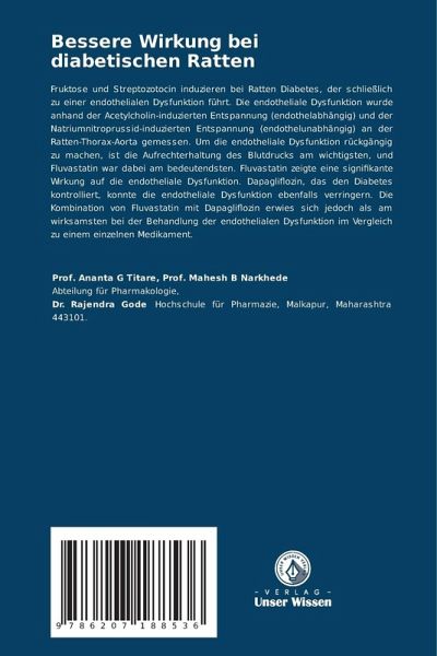 Fruktose und Streptozotocin induzieren bei Ratten Diabetes, der schließlich zu einer endothelialen Dysfunktion führt. Die endotheliale Dysfunktion wurde anhand der Acetylcholin-induzierten Entspannung (endothelabhängig) und der Natriumnitroprussid-induzierten Entspannung (endothelunabhängig) an der Ratten-Thorax-Aorta gemessen. Um die endotheliale Dysfunktion rückgängig zu machen, ist die Aufrechterhaltung des Blutdrucks am wichtigsten, und Fluvastatin war dabei am bedeutendsten. Fluvastatin zeigte eine signifikante Wirkung auf die endotheliale Dysfunktion. Dapagliflozin, das den Diabetes kontrolliert, konnte die endotheliale Dysfunktion ebenfalls verringern. Die Kombination von Fluvastatin mit Dapagliflozin erwies sich jedoch als am wirksamsten bei der Behandlung der endothelialen Dysfunktion im Vergleich zu einem einzelnen Medikament.