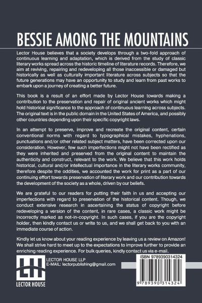 Bessie Among The Mountains This book is a result of an effort made by us towards making a contribution to the preservation and repair of original classic literature. In an attempt to preserve, improve and recreate the original content, we have worked towards: 1. Type-setting & Reformatting: The complete work has been re-designed via professional layout, formatting and type-setting tools to re-create the same edition with rich typography, graphics, high quality images, and table elements, giving our readers the feel of holding a 'fresh and newly' reprinted and/or revised edition, as opposed to other scanned & printed (Optical Character Recognition - OCR) reproductions. 2. Correction of imperfections: As the work was re-created from the scratch, therefore, it was vetted to rectify certain conventional norms with regard to typographical mistakes, hyphenations, punctuations, blurred images, missing content/pages, and/or other related subject matters, upon our consideration. Every attempt was made to rectify the imperfections related to omitted constructs in the original edition via other references. However, a few of such imperfections which could not be rectified due to intentional\unintentional omission of content in the original edition, were inherited and preserved from the original work to maintain the authenticity and construct, relevant to the work. We believe that this work holds historical, cultural and/or intellectual importance in the literary works community, therefore despite the oddities, we accounted the work for print as a part of our continuing effort towards preservation of literary work and our contribution towards the development of the society as a whole, driven by our beliefs. We are grateful to our readers for putting their faith in us and accepting our imperfections with regard to preservation of the historical content. HAPPY READING!