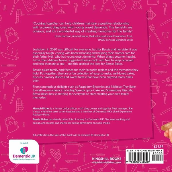 Lockdown in 2020 was difficult for everyone, but for Bessie and her sister it was especially tough, coping with homeschooling and helping their mother care for their father Neil, who has young onset dementia. When things became fraught, Lizzie, their Admiral Nurse, suggested Bessie cook with Neil to keep occupied and help them get along - and this sparked the idea for Bessie Bakes. Bessie asked family and friends for their favourite recipes and the memories they hold. Put together, they are a fun collection of easy-to-make, well-loved cakes, biscuits, savoury dishes and sweet treats that have been enjoyed many times over. From scrumptious delights such as Raspberry Brownies and Malteser Tray Bake to well-known classics including Speedy Spice Cake and Shrewsbury Biscuits, Bessie Bakes has something for everyone to start creating your own family memories.