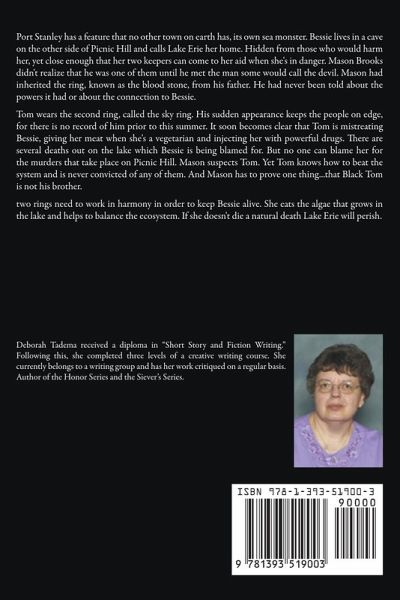 Port Stanley has a feature that no other town on earth has: its own sea monster. Bessie lives in a cave on the other side of Picnic Hill and calls Lake Erie her home. Hidden from those who would harm her, yet close enough that her two keepers can aid her when she's in danger. Mason Brooks didn't realize that he was one of them until he met the man some would call the devil. Mason had inherited the ring, known as the bloodstone, from his father. He had never been told about the powers it had or about the connection to Bessie. Tom wears the second ring, called the sky ring. His sudden appearance keeps the people on edge, for there is no record of him before this summer. It soon becomes clear that Tom is mistreating Bessie, giving her meat when she's a vegetarian and injecting her with powerful drugs. There are several deaths out on the lake, which Bessie is being blamed for. But no one can blame her for the murders that take place on Picnic Hill. Mason suspects Tom. Yet Tom knows how to beat the system and is never convicted of any of them. And Mason has to prove one thing...that Black Tom is not his brother. Two rings need to work in harmony to keep Bessie alive. She eats the algae that grow in the lake and helps to balance the ecosystem. If she doesn't die a natural death, Lake Erie will perish.