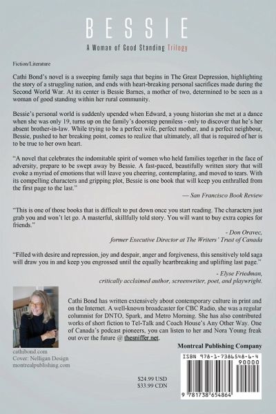 Cathi Bond's novel is a sweeping family saga that begins in The Great Depression, highlighting the story of a struggling nation, and ends with heart-breaking personal sacrifices made during the Second World War. At its centre is Bessie Barnes, a mother of two, determined to be seen as a woman of good standing within her rural community. ¿Bessie's personal world is suddenly upended when Edward, a young historian she met at a dance when she was only 19, turns up on the family's doorstep penniless - only to discover that he's her absent brother-in-law. While trying to be a perfect wife, perfect mother, and a perfect neighbour, Bessie, pushed to her breaking point, comes to realize that ultimately, all that is required of her is to be true to her own heart.