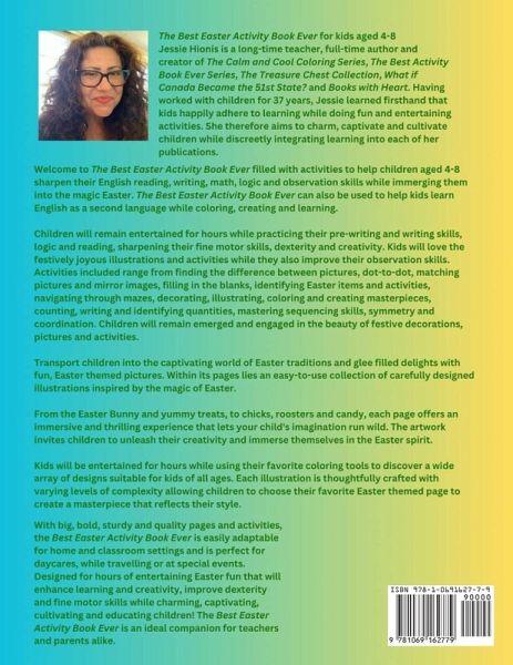 The Best Easter Activity Book Ever for kids aged 4-8 Jessie Hionis is a long-time teacher, full-time author and creator of The Calm and Cool Coloring Series, The Best Activity Book Ever Series, The Treasure Chest Collection, What if Canada Became the 51st State? and Books with Heart. Having worked with children for 37 years, Jessie learned firsthand that kids happily adhere to learning while doing fun and entertaining activities. She therefore aims to charm, captivate and cultivate children while discreetly integrating learning into each of her publications. Welcome to The Best Easter Activity Book Ever filled with activities to help children aged 4-8 sharpen their English reading, writing, math, logic and observation skills while immerging them into the magic of Easter. The Best Easter Activity Book Ever can also be used to help kids learn English as a second language while coloring, creating and learning. Children will remain entertained for hours while practicing their pre-writing and writing skills, logic and reading, sharpening their fine motor skills, dexterity and creativity. Kids will love the festively joyous illustrations and activities while they also improve their observation skills. Activities included range from finding the difference between pictures, dot-to-dot, matching pictures and mirror images, filling in the blanks, identifying Easter items and activities, navigating through mazes, decorating, illustrating, coloring and creating masterpieces, counting, writing and identifying quantities, mastering sequencing skills, symmetry and coordination. Children will remain emerged and engaged in the beauty of festive decorations, pictures and activities. Transport children into the captivating world of Easter traditions and glee filled delights with fun, Easter themed pictures. Within its pages lies an easy-to-use collection of carefully designed illustrations inspired by the magic of Easter. From the Easter Bunny and yummy treats, to chicks, roosters and candy, each page offers an immersive and thrilling experience that lets your child's imagination run wild. The artwork invites children to unleash their creativity and immerse themselves in the Easter spirit. Kids will be entertained for hours while using their favorite coloring tools to discover a wide array of designs suitable for kids of all ages. Each illustration is thoughtfully crafted with varying levels of complexity allowing children to choose their favorite Easter themed page to create a masterpiece that reflects their style. With big, bold, sturdy and quality pages and activities, the Best Easter Activity Book Ever is easily adaptable for home and classroom settings and is perfect for daycares, while travelling or at special events. Designed for hours of entertaining Easter fun that will enhance learning and creativity, improve dexterity and fine motor skills while charming, captivating, cultivating and educating children! The Best Easter Activity Book Ever is an ideal companion for teachers and parents alike.