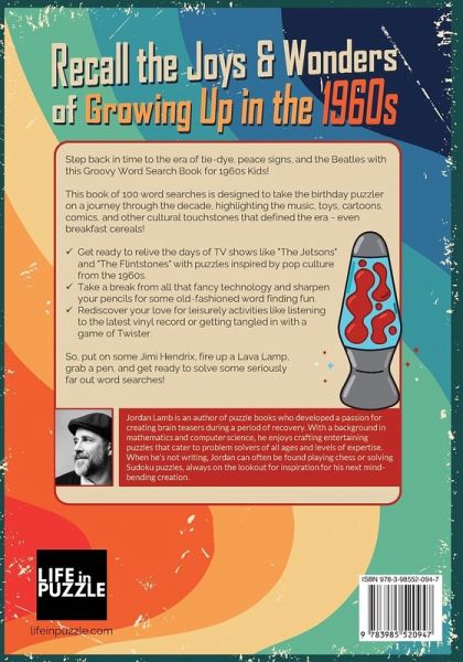 Relive Your Best Ever Childhood Memories of the 1960s with this Fun Word Search Puzzle Collection With this captivating adult word search book, you can enjoy a fantastic journey back to the magical days of your youth. It includes 100 puzzles inspired by pop culture that all 60s kids will remember: Step back in time to the swinging sixties and the era of tie-dye, peace signs, and the Beatles. Relive the days of cartoons like "The Flintstones" and "The Jetsons". Rediscover the excitement you felt when unwrapping an Etch-a-Sketch or Easy-Bake Oven on Christmas Day. This book of 100 word searches is designed to take you on a journey through the decade, highlighting the music, toys, cartoons, comics, and other cultural touchstones that defined your childhood - even breakfast cereals! Give the Gift of Nostalgia with this Groovy Word Search Book for 1960s Kids! Struggling to find the perfect birthday gift for adults in your life? Look no further. This unique and thoughtful gift is the perfect present for anyone born in the 60s who loves adult word games and reliving the good old days. Imagine the look of pure delight on their face as they unwrap this beautifully crafted time capsule. With each new puzzle, they will be whisked away to a bygone era, reliving the magical moments that shaped their childhood. It's a heartfelt gift that will evoke emotions, ignite nostalgia, and bring them closer to their fondest memories. It's a reminder of the cartoons, toys, snacks, music, movies, and the joyous adventures from their childhood. Nostalgic Puzzles You Won't Find Anywhere Else Each word search puzzle has been painstakingly researched and lovingly handcrafted, ensuring a unique experience that sets it apart from mass-produced books Take a break from all that fancy technology and sharpen a pencil for some good old-fashioned word finding fun. Laughter and excitement will fill the air as your party goers race to uncover hidden words from their favorite childhood memories at your swinging 60s party! Comes complete with solutions to all puzzles, giving you confidence that the answers are just a flip away. So, put on some Jimi Hendrix, fire up a Lava Lamp, and grab a pen as you relive your childhood while solving some seriously cool word searches!