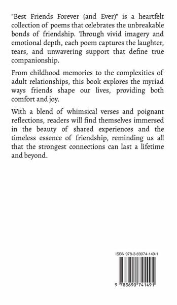 "Best Friends Forever (and Ever)" is a heartfelt collection of poems that celebrates the unbreakable bonds of friendship. Through vivid imagery and emotional depth, each poem captures the laughter, tears, and unwavering support that define true companionship. From childhood memories to the complexities of adult relationships, this book explores the myriad ways friends shape our lives, providing both comfort and joy. With a blend of whimsical verses and poignant reflections, readers will find themselves immersed in the beauty of shared experiences and the timeless essence of friendship, reminding us all that the strongest connections can last a lifetime and beyond.