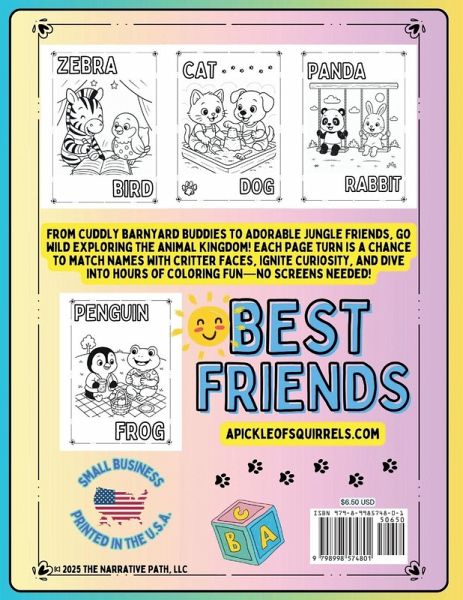 The Best Friends Coloring Book is a charming, screen-free activity book for toddlers and preschoolers ages 2-6. Packed with 26 cute and friendly animal pairs, this early learning coloring book encourages creativity, vocabulary growth, and fine motor skill development-all through fun, mess-free play. Each page features:Bold, simple outlines perfect for beginner coloring Large, clear spaces to help build coloring confidence Recognizable animals like cats, penguins, elephants, foxes, and more As children color, they'll also enjoy:Matching animal names to faces Strengthening hand-eye coordination Exploring early concepts of friendship and nature Spending hours in educational, screen-free entertainment Parents and caregivers will love this quiet, engaging activity, which fosters early childhood development and keeps little hands happily busy-at home, on the go, or in the classroom. Perfect for:Children ages 2, 3, 4, 5, and 6 Toddlers, preschoolers, and kindergarteners Early learning centers and daycare classrooms Road trips, rainy days, quiet time, or creative play Grab your crayons and meet your new best friends-one colorful page at a time!