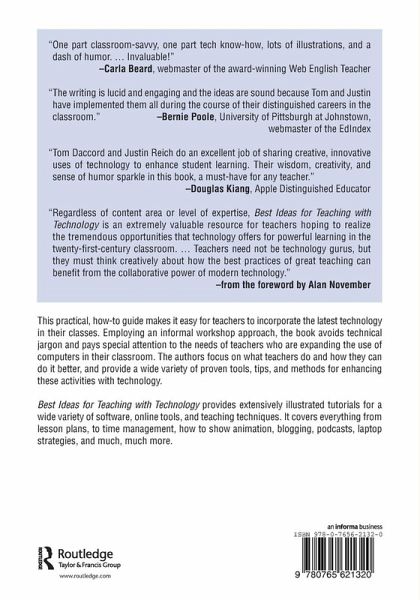 This practical, how-to guide makes it easy for teachers to incorporate the latest technology in their classes. Employing an informal workshop approach, the book avoids technical jargon and pays special attention to the needs of teachers who are expanding the use of computers in their classrooms. The authors focus on what teachers do and how they can do it better, and provide a wide variety of proven tools, tips, and methods for enhancing these activities with technology."Best Ideas for Teaching with Technology" provides extensively illustrated tutorials for a wide variety of software, online tools, and teaching techniques. It covers everything from lesson plans, to time management, how to show animation, blogging, podcasts, laptop strategies, and much, much more. In addition, periodic updates to the text will be available on the authors' website.