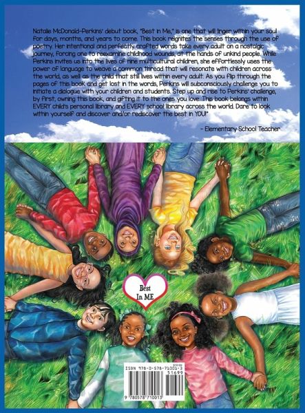 Natalie McDonald-Perkins' debut book, "Best in Me," is one that will linger within your soul for days, months, and years to come. This book reignites the senses through the use of poetry. Her intentional and perfectly crafted words take every adult on a nostalgic journey, forcing one to reexamine childhood wounds, at the hands of unkind people. While Perkins invites us into the lives of nine multicultural children, she effortlessly uses the power of language to weave a common thread that will resonate with children across the world, as well as the child that still lives within every adult. As you flip through the pages of this book and get lost in the words, Perkins will subconsciously challenge you to initiate a dialogue with your children and students. Step up and rise to Perkins' challenge, by first, owning this book, and gifting it to the ones you love. This book belongs within EVERY child's personal library and EVERY school library across the world. Dare to look within yourself and discover and/or rediscover the best in YOU!" -Elementary School Teacher