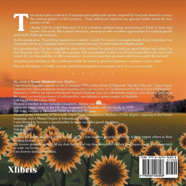 This book holds a collection of inspirational uplifting life quotes, inspired by God and shared to convey the wisdom gained on life's journey.. These reflections represent my genuine beliefs about the true essence of life. I firmly hold the belief that each of us is a timeless spiritual being, journeying on Earth to learn and evolve. Our world, like a grand classroom, presents us with countless opportunities for spiritual growth amid both challenges and joys. As the saying goes, "Everything happens for a reason," a truth I've found to resonate deeply. Every experience we encounter serves as a stepping stone on our unique journeys toward spiritual enlightenment. As a grandmother, I've felt compelled to share what wisdom I've gained to both my grandchildren and others I've met along the way. Today's youth often grapple with uncertainties amidst a world seemingly filled with chaos and unrest. It's my responsibility to offer reassurance, to remind them that goodness still thrives amidst the turmoil. Accepting and adapting to life's challenges holds the secret to genuine happiness-a lesson I aim to share. May an abundance of health, success, and lasting happiness accompany each of you on your path