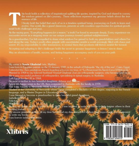 This book holds a collection of inspirational uplifting life quotes, inspired by God and shared to convey the wisdom gained on life's journey.. These reflections represent my genuine beliefs about the true essence of life. I firmly hold the belief that each of us is a timeless spiritual being, journeying on Earth to learn and evolve. Our world, like a grand classroom, presents us with countless opportunities for spiritual growth amid both challenges and joys. As the saying goes, "Everything happens for a reason," a truth I've found to resonate deeply. Every experience we encounter serves as a stepping stone on our unique journeys toward spiritual enlightenment. As a grandmother, I've felt compelled to share what wisdom I've gained to both my grandchildren and others I've met along the way. Today's youth often grapple with uncertainties amidst a world seemingly filled with chaos and unrest. It's my responsibility to offer reassurance, to remind them that goodness still thrives amidst the turmoil. Accepting and adapting to life's challenges holds the secret to genuine happiness-a lesson I aim to share. May an abundance of health, success, and lasting happiness accompany each of you on your path