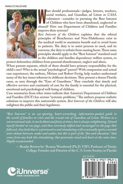 What should professionals?judges, lawyers, teachers, social workers, and Guardian ad Litem or CASA volunteers ?consider in pursuing the Best Interest of Children who have been abandoned, neglected or abused? How can Department of Children and Families improve their systems? Best Interests of the Children explains that the ethical principles of Beneficence and Non-Maleficence exist in the medical world to maximize benefit and to avoid harm to patients. The duty is to assist persons in need, and its converse, the duty to refrain from causing harm. These same principles should apply to the ?Best Interest? standard used in the children and families dependency welfare system, to protect defenseless children from parental abandonment, neglect and abuse. When parents separate, which of them should have primary responsibility for the child?s care? Who is the actual ?psychological? parent? With compassion and actual case experiences, the authors, Miriam and Robert Fertig, help readers understand many of the key issues inherent in childcare decisions. They present a dozen Florida cases, as seen through the ?Eyes of Guardians.? They conclude that timely and effective services and continuity of care for the family is essential for the physical, emotional and psychological well-being of children. Case summaries from other states indicate that America?s Department of Children and Families (DCF) has serious ?systemic problems.? The authors propose realistic solutions to improve this nationwide system. Best Interests of the Children will also enlighten the public and their legislators. ?Best Interests? is an eye-opening, heart-wrenching, information-packed guide to the world of families in crisis and the crucial role of Guardian ad Litem. Written in a conversational style, it can be blunt and feisty at times, but is always enlightening. I found myself shocked on one page, and then extremely edified and encouraged on the page that followed. Any book that is so provocative and stimulating will occasionally ignite a mental mini-debate between reader and author, but this is part of the ?fun and education,? that comes from any book this stimulating, that penetrates mind and heart at the same time. Highly recommended. ? Reader Review by: Thomas Woodward (Ph.D. USF), Professor of Trinity College, Founder and Director of the C. S. Lewis Society, in Florida