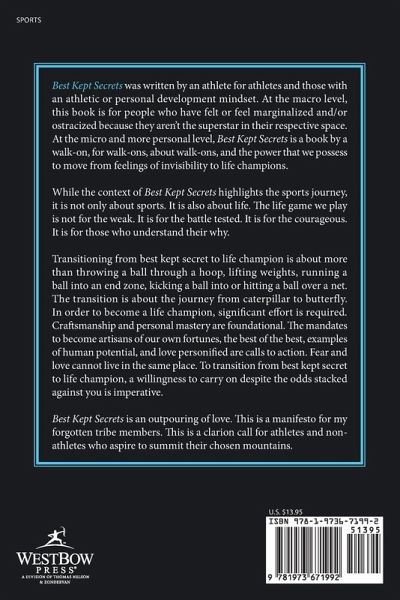 Best Kept Secrets was written by an athlete for athletes and those with an athletic or personal development mindset. At the macro level, this book is for people who have felt or feel marginalized and/or ostracized because they aren't the superstar in their respective space. At the micro and more personal level, Best Kept Secrets is a book by a walk-on, for walk-ons, about walk-ons, and the power that we possess to move from feelings of invisibility to life champions. While the context of Best Kept Secrets highlights the sports journey, it is not only about sports. It is also about life. The life game we play is not for the weak. It is for the battle tested. It is for the courageous. It is for those who understand their why. Transitioning from best kept secret to life champion is about more than throwing a ball through a hoop, lifting weights, running a ball into an end zone, kicking a ball into or hitting a ball over a net. The transition is about the journey from caterpillar to butterfly. In order to become a life champion, significant effort is required. Craftsmanship and personal mastery are foundational. The mandates to become artisans of our own fortunes, the best of the best, examples of human potential, and love personified are calls to action. Fear and love cannot live in the same place. To transition from best kept secret to life champion, a willingness to carry on despite the odds stacked against you is imperative. Best Kept Secrets is an outpouring of love. This is a manifesto for my forgotten tribe members. This is a clarion call for athletes and non-athletes who aspire to summit their chosen mountains.