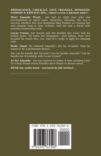 PROVOCATIVE, CHICK-LIT, LOVE TRIANGLE, ROMANTIC COMEDY & EXPLICIT SEX....there's even a kitchen sink!!! Meet Amanda Wyatt - she had an eight year plan and accomplished so much more. Attractive, talented, she was a success whether she was designing high fashion or running her own elegant shop in New Orleans. And she had a friend with benefits relationship with Lucas Crosse, her lawyer and the brother she never had for twelve years. He knew her intimately - well almost. Now, he's decided he wants that, too. And he's ready to fight for Amanda with Wade Lloyd. He entered Amanda's life by accident. Now he wants to be a permanent fixture. But can he handle her success? Can he handle Amanda? Can he handle her friendship with Lucas Crosse? As for Amanda - she has choices to make. A new, exciting love? Or a best friend whose benefits she's begun to dream about. HEAR the audio book - narrated by Jill Arehart.... ________________________________