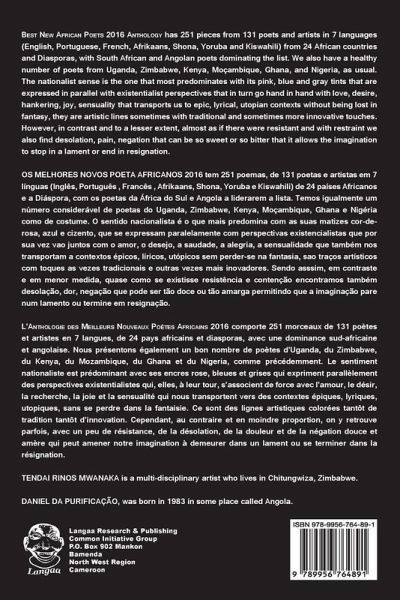 Best New African Poets 2016 Anthology has 251 pieces from 131 poets and artists in 7 languages (English, Portuguese, French, Afrikaans, Shona, Yoruba and Kiswahili) from 24 African countries and Diasporas, with South African and Angolan poets dominating the list. We also have a healthy number of poets from Uganda, Zimbabwe, Kenya, Moçambique, Ghana, and Nigeria, as usual. The nationalist sense is the one that most predominates with its pink, blue and gray tints that are expressed in parallel with existentialist perspectives that in turn go hand in hand with love, desire, hankering, joy, sensuality that transports us to epic, lyrical, utopian contexts without being lost in fantasy, they are artistic lines sometimes with traditional and sometimes more innovative touches. However, in contrast and to a lesser extent, almost as if there were resistant and with restraint we also find desolation, pain, negation that can be so sweet or so bitter that it allows the imagination to stop in a lament or end in resignation.