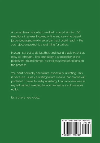 A friend once told me I should aim for 100 rejections in a year. She wasn't just encouraging me to set a bar that I could reach - the 100 rejection project is a real thing. In 2021, I gave it a go. This is a collection of the pieces that found homes and some reflections on the process. You don't normally see failure, especially in writing. This is because usually a writing failure means that no one will publish it. Thanks to self-publishing, I can now embarrass myself without needing to inconvenience a submissions editor. It's a brave new world.