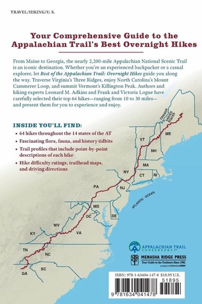 Your Comprehensive Guide to the AT's Best Overnight Hikes From Maine to Georgia, the nearly 2,200-mile Appalachian National Scenic Trail is an iconic destination. Whether you're an experienced backpacker or a casual explorer, let Best of the Appalachian Trail: Overnight Hikes guide you along the way. Traverse Virginia's Three Ridges, enjoy North Carolina's Mount Cammerer Loop, and summit Vermont's Killington Peak. Appalachian Trail experts Leonard M. Adkins and Victoria and Frank Logue have carefully selected their top 64 hikes-ranging from 10 to 30 miles-and present them for you to experience and enjoy. Trail difficulty ratings and profiles, which include point-by-point descriptions of each hike, help to prepare you for what's ahead. Trailhead maps and driving directions are provided to get you where you need to go. Plus, fascinating flora, fauna, and history tidbits entertain and educate you along all 64 hikes throughout the 14 states of the AT. Discover the best overnight hikes in this useful guide to the beloved long trail.