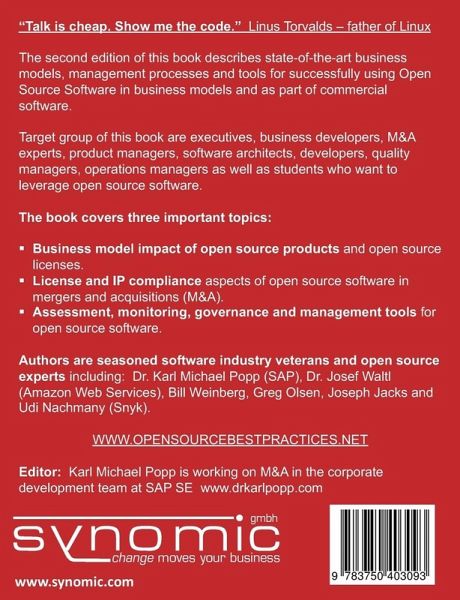 This book enables you to leverage the state-of-the-art of creating open source based business models and of managing open source in the development cycle of commercial software and during due diligence in mergers and acquisitions. In addition, it provides information about why investments in open source makes sense. Practitioners, investors and consultants created this book to help professionals in the software business like investors, executives, business developers, product managers, architects, developers, quality managers, development operations managers as well as students to get acquainted and proficient in using open source products in a commercial context.First, the focus is on business model impact of open source products and open source licenses. Dr. Karl Michael Popp gives an overview of the different types of business models for open source companies. Dr. Josef Waltl shows how open source licenses and intellectual property strategies can create a unique business modelbased on a combination of open source and proprietary software.Then, the focus is on detection and license compliance aspects of open source software in mergers and acquisitions. The acquisition of a software vendor requires the review of intellectual property rights including open source license compliance as described by Dr. Karl Michael Popp. The following new chapter, authored by Joseph Jacks from OSS Capital, provides fundamentals of the open source business by elaborating on value creation and value capture for commercial open source companies.Then, two chapters cover the offerings of tool vendors for governance of open source software but also for development enablement. First, Bill Weinberg and Greg Olsen show the broad offering of solutions of Black Duck Software, a provider for open source governance and enablement tools.The next, new chapter, provided by Snyk, focuses on development aspects of using open source software as part of commercial products like assistance for developers in selection and in continuously updating open source components during the software development lifecycle.