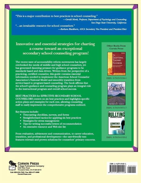 The book is designed for secondary school counsellors faced with moving their current programmes from service-centered to programme-centered focus. The new school environment of standards-based and data-based practices is leading counselling programmes to establish student competencies and implement a process of continuous evaluation and improvement, and the authors provide the necessary tools for this transition following the ASCA Standards. The book identifies five core strategies that impact and improve the effectiveness of secondary school counselors, by focusing on continuous improvement, advisement, career education, transition, and communication.