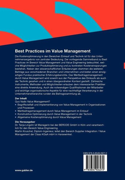 Die Kostenoptimierung in den Bereichen Einkauf und Technik ist für das Unternehmensergebnis von zentraler Bedeutung. Der vorliegende Sammelband zu Best Practices im Bereich Value Management und Value Engineering beleuchtet, welche Möglichkeiten zur Produktoptimierung und zu konkreten Kosteneinsparungen bestehen. Neben den wissenschaftlichen Erläuterungen stammen die weiteren Beiträge aus verschiedenen Branchen und Unternehmen und bieten einen einzigartigen Fundus praktischer Erfahrungsberichte. Das Wertbeitragsmanagement durch Value Management wird sowohl aus der Perspektive des Einkaufs als auch der Technik gesehen und in einen übergeordneten Kontext gestellt. Zahlreiche Instrumente, Methoden und Möglichkeiten erlauben dem interessierten Praktiker eine direkte Anwendung. Auch die notwendigen Qualifikationen der Mitarbeiter und wichtige organisatorische Aspekte für eine nachhaltige Verankerung in der Unternehmenshierarchie runden die Beitragssammlung ab.