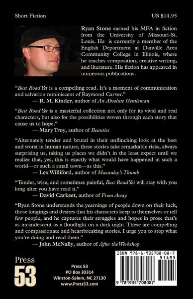 John McNally, author of After the Workshop, says of Best Road Yet, "Ryan Stone understands the yearnings of people down on their luck, those longings and desires that his characters keep to themselves or tell few people, and he captures their struggles and hopes in prose that's as incandescent as a floodlight on a dark night. These are compelling and compassionate and heartbreaking stories. I urge you to stop what you're doing and read them." And Mary Troy, author of Beauties, says, "Ryan Stone gives us a fast-paced tour of the hearts and minds of men who do not belong in their own lives, and who, though they know it, remain surprised by that knowledge. Best Road Yet is a masterful collection not only for its vivid and real characters, but also for the possibilities woven through each story that cause us to hope-as the characters' decisions and lack of decisions lead them along-each new road will be the best one yet."