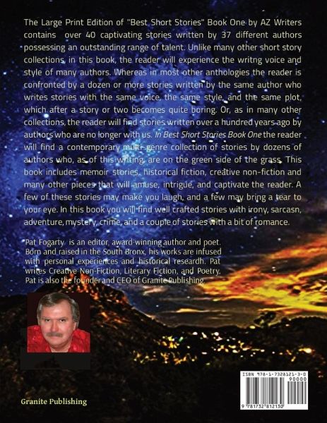 The Large Print Edition of "Best Short Stories" Book One by AZ Writers contains over 40 captivating stories written by 37 different authors possessing an outstanding range of talent. Unlike many other short story collections, in this book, the reader will experience the writng voice and style of many authors. Whereas in most other anthologies the reader is confronted by a dozen or more stories written by the same author who writes stories with the same voice, the same style, and the same plot, which after a story or two becomes quite boring. Or, as in many other collections, the reader will find stories written over a hundred years ago by authors who are no longer with us. In Best Short Stories Book One the reader will find a contemporary multi-genre collection of stories by dozens of authors who, as of this writing, are on the green side of the grass. This book includes memoir stories, historical fiction, creative non-fiction and many other pieces that will amuse, intrigue, and captivate the reader. A few of these stories may make you laugh, and a few may bring a tear to your eye. In this book you will find well crafted stories with irony, sarcasn, adventure, mystery, crime, and a couple of stories with a bit of romance.