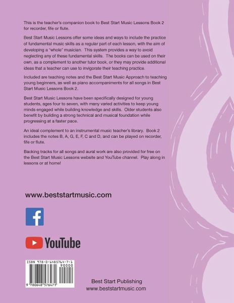 Best Start Music Lessons Book 2 for Teachers, is the teachers companion for the student book, Best Start Music Lessons Book 2, for recorder, fife and flute. This book contains piano accompaniments for all of the songs in student book 2. The teachers' companion book to student Book 1 contains examples of how the aural activities may be played on the piano. Examples can also be found at www.beststartmusic.com. Best Start Music Lessons Book 2 introduces foundational musical concepts and skills to the young beginner starting on recorder, fife or flute. As well as developing musical skills and competencies, these lessons aim to foster a love of music and music making. Best Start Music Lessons are a comprehensive system of learning in which the students are truly engaged, ensuring that musical concepts are thoroughly understood, developing a solid foundation of key skills, and providing the best musical start possible. Best Start Music Lessons are ideal for instrumental music teachers. Beautifully presented lessons provide teachers with clear and engaging lesson plans that make teaching easy and learning fun. Until now children have not typically been taught woodwind instruments until around age eight. Best Start Music Lessons allows children to start learning music and learning a woodwind instrument from age four. Originally developed for children aged 4 to 7 years, it is also a great resource for older students who may progress through the books faster, while still developing a strong musical foundation. Features include: Engaging and interactive - many different activities including writing, drawing, colouring, movement, improvisation Slow paced progression to accomodate the youngest beginners Structured lessons provide a familiar routine Suitable for individual or group tuition Activities suitable for classroom use Clear format - easy for teachers to teach and easy for parents to reinforce learning at home The skills developed in this book are readily transferable to other instruments, making the transition to new instruments and school band programs easy. Best Start Music Lessons emphasizes the development of strong aural and rhythmic skills. The methodologies of Kodaly, Orff and Dalcroze have provided inspiration for many of the activities. Inspiration has also been drawn from the works of author, educator and composer, Paul Harris. A list of further reading is provided on the Best Start Music website: www.beststartmusic.com. Best Start Music Lessons can be used in a variety of ways to suit individual students and teachers: Older students - may spend one week on each lesson. Younger students - may spend two weeks on each lesson. Teachers can choose which activities to spend more time on each week according to the flow of lessons and individual student needs. No need to complete all activities in one lesson before moving on to the next. Lessons can be repeated on multiple instruments. When repeating the lessons, musical skills and activities are familiar - this gives space to concentrate on tone and technique. Best Start Music Lessons aim to empower children by giving them the tools and skills to decode and analyze music easily.