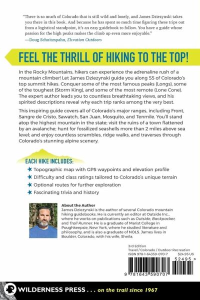 Acknowledgments List of Primary Peaks and Elevations Locator Map Preface The Colorado Rocky Mountains Safety in the Mountains Other Hiking Considerations Using This Book The Hikes 1. James Peak 2. Navajo Peak 3. Jasper Peak 4. Guardians of the Flatirons: Green Mountain, Bear Peak, and South Boulder Peak 5. Lead Mountain 6. Clark Peak 7. Mount Richthofen 8. Longs Peak 9. Mount Alice 10. Mount Ida–Chief Cheley Peak Traverse 11. Mount Chapin–Mount Chiquita–Ypsilon Mountain Traverse 12. Mount Sniktau–Grizzly Peak Traverse 13. The Citadel 14. Peak 1–Tenmile Peak Traverse 15. Pacific Peak 16. Mount Powell 17. Deming Mountain 18. Stanley Mountain and Vasquez Peak 19. Mount Elbert 20. Mount Sherman–Gemini Peak–Dyer Mountain Traverse 21. Mount Hope 22. Huron Peak 23. Mount Ouray 24. Carbonate Mountain–Tabeguache Peak Circuit 25. Mount Yale 26. Fools Peak 27. Mount Thomas 28. Mount of the Holy Cross 29. Bison Peak 30. Mount Zirkel 31. Hahns Peak 32. Geissler Mountain Rim Walk 33. Summit Peak 34. Hesperus Mountain 35. Mount Sopris 36. Treasury Mountain 37. Belleview Mountain 38. East Beckwith Mountain–Far East Peak Traverse 39. West Spanish Peak 40. Blanca Peak–Ellingwood Point Traverse 41. Mount Adams 42. Eureka Mountain–Hermit Peak 43. Chicago Basin Fourteener Circuit: Windom Peak–Sunlight Peak–Mount Eolus 44. Cross Mountain–Base of Lizard Head Traverse 45. Storm King Peak 46. Uncompahgre Peak 47. Redcloud Peak–Sunshine Peak Traverse 48. Golden Horn 49. Mount Sneffels 50. Lone Cone Bonus Hikes 1. Cooper Peak 2. Rio Grande Pyramid 3. Sawtooth Mountain–Red Deer Mountain 4. Mount Flora 5. Tabor Peak Appendix A: Best Hikes and Others of Note Appendix B: Good Weekend Getaways Appendix C: Colorado’s 100 Highest Peaks Appendix D: Resources Index About the Author