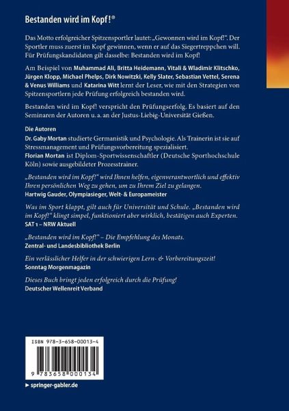 Das Motto erfolgreicher Spitzensportler lautet: "Gewonnen wird im Kopf!". Der Sportler weiß, dass er zuerst im Kopf gewinnen muss, wenn er auf das Siegertreppchen steigen will. Für Prüfungskandidaten gilt dasselbe: Bestanden wird im Kopf! Die Autoren haben die Strategien von Spitzensportlern analysiert und für Prüfungskandidaten nutzbar gemacht. Am Beispiel von Muhammad Ali, Steffi Graf, Hermann Maier, Jürgen Klinsmann, Franziska van Almsick, Boris Becker und Michael Schumacher lernt der Leser, wie er schädliche Verhaltensmuster erkennt, hinterfragt und durch vorteilhafte Muster ersetzt. Die Sportler-Zitate zeigen, welche Motivationssätze Sportgrößen nutzen, um sich von störenden Gedanken zu befreien und auch unter hohem Druck Bestleistungen zu erbringen.Das Konzept Bestanden wird im Kopf! ist praxiserprobt und verspricht den Prüfungserfolg. Es basiert auf den effektiven Seminaren der Autoren sowie ihrer Vorlesung an der Justus-Liebig-Universität Gießen.Bestanden wird im Kopf! ist ein verlässlicher Helfer in der schwierigen Lern- und Vorbereitungszeit. Das Buch bringt den Leser auf direktem Weg zum Ziel: Erfolgreich durch die Prüfung.