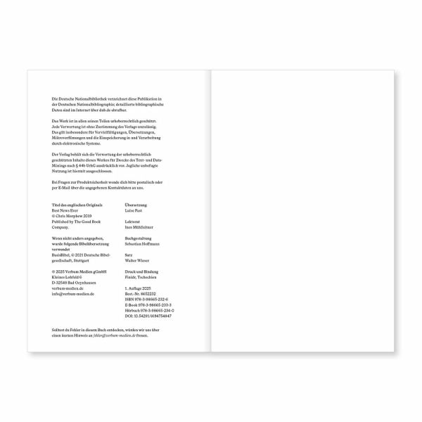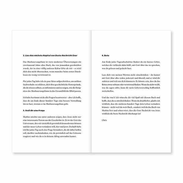 Wann hast du das letzte Mal eine unglaublich gute Nachricht erhalten? Eine, die du nicht für dich behalten konntest, weil sie zu schön war. Das Markusevangelium ist genau das! Es berichtet von Jesus - und das verändert alles. 'Beste Nachricht ever' ist ein Andachtsbuch für Kids und Teenager ab 8 Jahren. Es nimmt sie mit auf eine 100-tägige Reise durch das Markusevangelium. Die Andachten enthalten kurze Abschnitte des Bibeltextes, erläutern die schwierigen Stellen und stellen Bezüge zum Leben der Kinder her. Vor allem aber zeigen sie ihnen Jesus! Eine Frage zum Nachdenken und ein Gebet helfen, das Gelesene zu reflektieren und vor Gott zu bewegen. Das Buch ist in einem für Kids und Teenager ansprechenden und gut lesbaren Stil geschrieben. Es hilft ihnen, die Bibel für sich selbst zu entdecken, unabhängig von ihrem Vorwissen. Das Buch kann auch als Andachtsbuch in der Familie eingesetzt werden. ¿ Andachten für Kids und Teenager ab 8 Jahren ¿ Kann unabhängig vom Vorwissen gelesen werden ¿ Eignet sich als Andachtsbuch für Familien