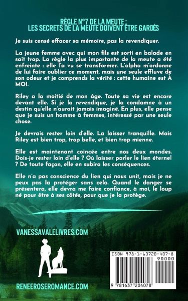 RÈGLE N°7 DE LA MEUTE : LES SECRETS DE LA MEUTE DOIVENT ÊTRE GARDÉS Je suis censé effacer sa mémoire, pas la revendiquer. La jeune femme avec qui mon fils est sorti en balade en sait trop. La règle la plus importante de la meute a été enfreinte : elle l'a vu se transformer. L'alpha m'ordonne de lui faire oublier ce moment, mais une seule effluve de son odeur et je comprends la vérité : cette humaine est À MOI. Riley a la moitié de mon âge. Toute sa vie est encore devant elle. Si je la revendique, je la condamne à un destin qu'elle n'aurait jamais imaginé. En plus, elle pense que je suis un homme à femmes, intéressé par une seule chose. Je devrais rester loin d'elle. La laisser tranquille. Mais Riley est bien trop, trop belle, et bien trop mienne. Elle est maintenant coincée entre nos deux mondes. Dois-je rester loin d'elle ? Où laisser parler le lien éternel ? De toute façon, elle en subira les conséquences. Elle n'a pas conscience du lien qui nous unit, mais je ne peux pas la protéger sans cela. Quand le danger se présentera, elle devra me faire confiance, à moi, le loup né pour être à ses côtés, pour que je la protège.