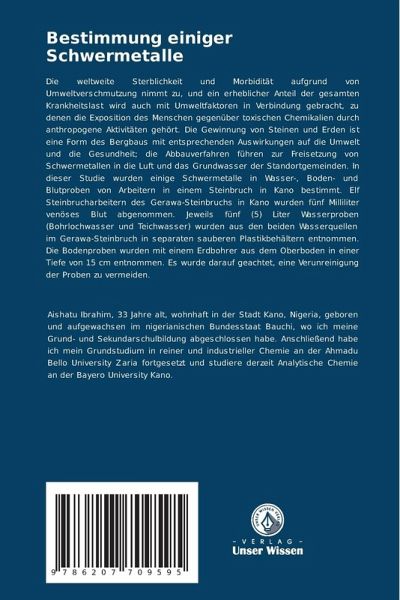 Die weltweite Sterblichkeit und Morbidität aufgrund von Umweltverschmutzung nimmt zu, und ein erheblicher Anteil der gesamten Krankheitslast wird auch mit Umweltfaktoren in Verbindung gebracht, zu denen die Exposition des Menschen gegenüber toxischen Chemikalien durch anthropogene Aktivitäten gehört. Die Gewinnung von Steinen und Erden ist eine Form des Bergbaus mit entsprechenden Auswirkungen auf die Umwelt und die Gesundheit; die Abbauverfahren führen zur Freisetzung von Schwermetallen in die Luft und das Grundwasser der Standortgemeinden. In dieser Studie wurden einige Schwermetalle in Wasser-, Boden- und Blutproben von Arbeitern in einem Steinbruch in Kano bestimmt. Elf Steinbrucharbeitern des Gerawa-Steinbruchs in Kano wurden fünf Milliliter venöses Blut abgenommen. Jeweils fünf (5) Liter Wasserproben (Bohrlochwasser und Teichwasser) wurden aus den beiden Wasserquellen im Gerawa-Steinbruch in separaten sauberen Plastikbehältern entnommen. Die Bodenproben wurden mit einem Erdbohrer aus dem Oberboden in einer Tiefe von 15 cm entnommen. Es wurde darauf geachtet, eine Verunreinigung der Proben zu vermeiden.