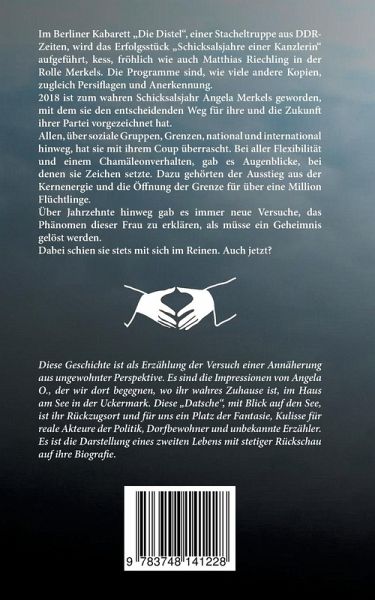 Im Berliner Kabarett ''Die Distel'', einer Stacheltruppe aus DDR-Zeiten, wird das Erfolgsstück ''Schicksalsjahre einer Kanzlerin'' aufgeführt, kess, fröhlich wie auch Matthias Riechling in der Rolle Merkels. Die Programme sind, wie viele andere Kopien, zugleich Persiflagen und Anerkennung. 2018 ist zum wahren Schicksalsjahr Angela Merkels geworden, mit dem sie den entscheidenden Weg für ihre und die Zukunft ihrer Partei vorgezeichnet hat. Allen, über soziale Gruppen, Grenzen, national und international hinweg, hat sie mit ihrem Coup überrascht. Bei aller Flexibilität und einem Chamäleonverhalten, gab es Augenblicke, bei denen sie Zeichen setzte. Dazu gehörten der Ausstieg aus der Kernenergie und die Öffnung der Grenze für über eine Million Flüchtlinge.Über Jahrzehnte hinweg gab es immer neue Versuche, das Phänomen dieser Frau zu erklären, als müsse ein Geheimnis gelöst werden. Dabei schien sie stets mit sich im Reinen. Auch jetzt?Diese Geschichte ist als Erzählung der Versuch einer Annäherung aus ungewohnter Perspektive. Es sind die Impressionen von Angela O., der wir dort begegnen, wo ihr wahres Zuhause ist, im Haus am See in der Uckermark. Diese ''Datsche'', mit Blick auf den See, ist ihr Rückzugsort und für uns ein Platz der Fantasie, Kulisse für reale Akteure der Politik, Dorfbewohner und unbekannte Erzähler. Es ist die Darstellung eines zweiten Lebens mit stetiger Rückschau auf ihre Biografie.
