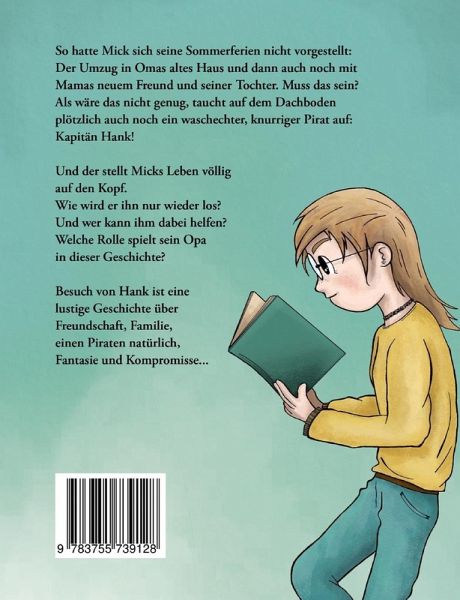 So hatte Mick sich seine Sommerferien nicht vorgestellt: Der Umzug in Omas altes Haus und dann auch noch mit Mamas neuem Freund und seiner Tochter. Muss das sein? Als wäre das nicht genug, taucht auf dem Dachboden plötzlich auch noch ein waschechter, knurriger Pirat auf: Kapitän Hank!Und der stellt Micks Leben völlig auf den Kopf. Wie wird er ihn nur wieder los? Und wer kann ihm dabei helfen? Welche Rolle spielt sein Opa in dieser Geschichte?"Besuch von Hank" ist eine lustige Geschichte über Freundschaft, Familie, einen Piraten natürlich, Fantasie und Kompromisse...