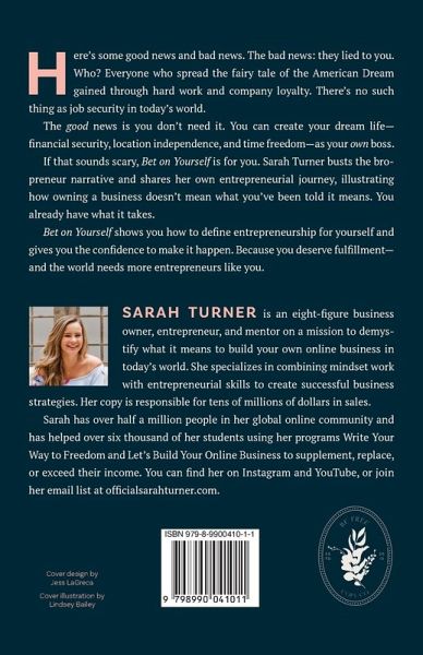 Here's some good news and bad news. The bad news: they lied to you. Who? Everyone who spread the fairy tale of the American Dream gained through hard work and company loyalty. There's no such thing as job security in today's world. The good news is you don't need it. You can create your dream life-financial security, location independence, and time freedom-as your own boss. If that sounds scary, Bet on Yourself is for you. Sarah Turner busts the bropreneur narrative and shares her own entrepreneurial journey, illustrating how owning a business doesn't mean what you've been told it means. You already have what it takes. Bet on Yourself shows you how to define entrepreneurship for yourself and gives you the confidence to make it happen. Because you deserve fulfillment-and the world needs more entrepreneurs like you.
