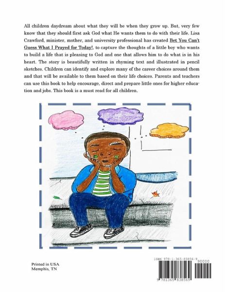 Bet You Can't Guess What I Prayed for Today!, is meant to teach children that God is not a distant, detached God but rather someone they can talk to and lean to for help. It is also meant to teach them that prayer works and that God will hear them when it seems that no one else does. And He loves them enough to be interested in every area of their lives.