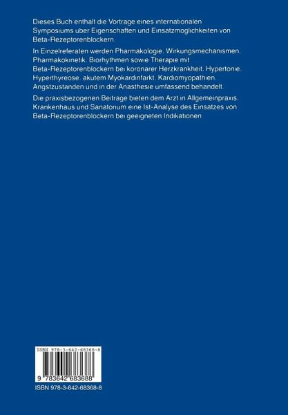 Rezeptorstudien mit ?-Rezeptorenblockern.- Beta Blockade and Myocardial Growth.- Pharmakokinetische Unterschiede zwischen ?-Rezeptorenblockern.- Clinically Significant Drug Interactions with Beta Adrenoceptors.- Biorhythmik der Arzneimittelwirkung unter besonderer Berücksichtigung der ?-Rezeptorenblocker.- ?-Rezeptorenblocker oder Kalziumantagonisten bei supraventrikulären Tachykardien.- ?-Blockade bei Angina pectoris.- ?-Blockade und Ischämietoleranz am isolierten Warmblüterherzen.- Beta Adrenergic Blockade During Acute Myocardial Infarction: Effect on Myocardial Function and Metabolism.- Möglichkeiten und Risiken der ?-Blockade beim akuten Myokardinfarkt.- Therapie des akuten Myokardinfarkts mit ?-Rezeptorenblockern.- Koronarchirurgie und medikamentöse Therapie im Vergleich.- Hypertonietherapie mit ?-Rezeptorenblockern.- ?-Blocker versus Diuretika als Medikamente der ersten Wahl in der Hochdrucktherapie.- Treatment of Congestive Cardiomyopathy.- Langzeitstudien - Grundsätze und Probleme heute.- Auswertung einer Hochdrucktherapiestudie mit Bupranolol, einem ?-Rezeptorenblocker.- Fahrstudie Höhenried (Pilotstudie).- Chronic Beta Blockade after Myocardial Infarction.- ?-Rezeptorblockade in der Anästhesie158.- Angstbehandlung mit Benzodiazepinen und ?-Blockern in der ärztlichen Praxis.- Kontraindikationen und Nebenwirkungen von ?-Rezeptorenblockern.- Zusammenfassung von Diskussionsbeiträgen.