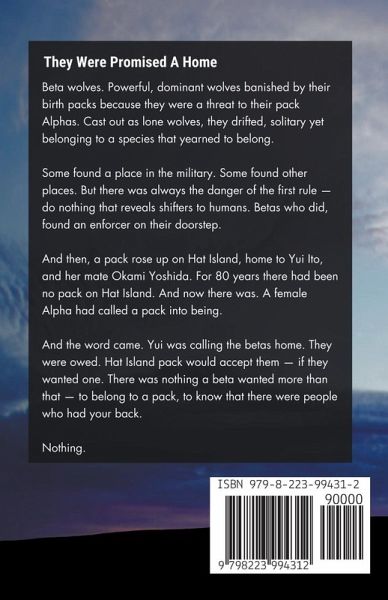 They Were Promised A Home Beta wolves. Powerful, dominant wolves banished by their birth packs because they were a threat to their pack Alphas. Cast out as lone wolves, they drifted, solitary yet belonging to a species that yearns to belong. Some found a place in the military. Some found other places. But there was always the danger of violating the first rule - do nothing that reveals shifters to humans. Betas who did, found an enforcer on their doorstep. And then, a pack rose up on Hat Island, home to Yui Ito, and her mate Okami Yoshida. The pack there had been killed off during World War II, all but Yui. For 80 years there had been no pack on Hat Island. And now there was. A female Alpha had called a pack into being. And the word came. Yui was calling the betas home. They were owed. There was a pack that would accept them - if they wanted one. There was nothing a beta wanted more than that - to belong to a pack, to know that there were people who had your back. Nothing. Book 6 in Wolf Harbor, a paranormal suspense series.