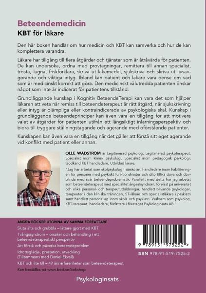 BETEENDEMEDICIN - KBT för läkare Den här boken handlar om hur medicin och KBT kan samverka och hur de kan komplettera varandra. Läkare har tillgång till flera åtgärder och tjänster som är åtråvärda för patienten. De kan undersöka, ordna med provtagningar, remittera till annan specialist, trösta, lugna, friskförklara, skriva ut läkemedel, sjukskriva och skriva ut livsavgörande och viktiga intyg. Ibland kan patient och läkare vara oense om vad som är medicinskt korrekt att göra. Den medicinskt välutredda patienten önskar något som inte är indicerat för patientens tillstånd. Grundläggande kunskap i Kognitiv BeteendeTerapi kan vara det som hjälper läkaren att veta när remiss till beteendeterapeut är rätt åtgärd, när sjukskrivning eller intyg är olämpliga eller kontraindicerade av psykologiska skäl. Kunskap i grundläggande beteendeprinciper kan även vara en tillgång för att motivera valet av åtgärder för patienten utifrån ett långsiktigt inlärningsperspektiv och bidra till tryggare ställningstagande och agerande med oförstående patienter. Kunskapen kan även vara en tillgång när det gäller att förstå sitt eget agerande vid konflikt med patient eller annan.