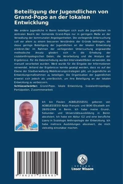 Wie andere Jugendliche in Benin beteiligen sich auch die Jugendlichen im zentralen Bezirk der Gemeinde Grand-Popo nur in geringem Maße an der Verwaltung der kommunalen Angelegenheiten. Die vorliegende Untersuchung soll vor allem zu einem besseren Verständnis der Gründe beitragen, die diese geringe Beteiligung der Jugendlichen an der lokalen Entwicklung erklären.Der im Rahmen der vorliegenden Untersuchung angewandte methodische Ansatz gliedert sich in die Erhebung der sozialanthropologischen Daten, die Verarbeitung und die Analyse der Ergebnisse. Für die Datenerhebung wurden Interviewleitfäden verwendet, die manuell verarbeitet wurden. Word wurde für die Eingabe der Informationen verwendet. Anhand der Ergebnisse konnte gezeigt werden, dass es auf der Ebene der Stadtverwaltung Mobilisierungsstrategien gibt, um Jugendliche an Entwicklungsmaßnahmen zu beteiligen. Die Organisation der Jugendlichen erweist sich jedoch als unerlässlich, um ihre Beteiligung an der lokalen Entwicklung zu verbessern.Schlüsselwörter: Grand-Popo, lokale Entwicklung, Sozialanthropologie, Partizipation, Zusammenarbeit