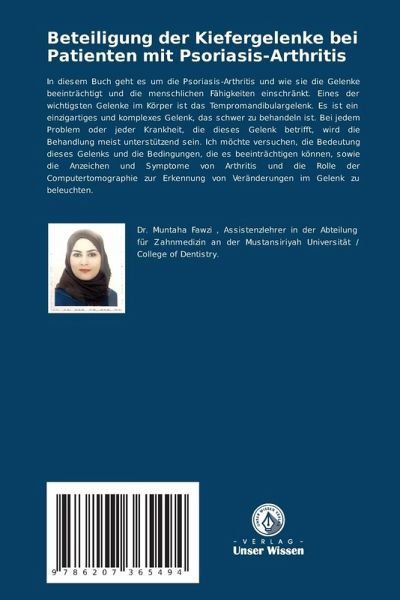 In diesem Buch geht es um die Psoriasis-Arthritis und wie sie die Gelenke beeinträchtigt und die menschlichen Fähigkeiten einschränkt. Eines der wichtigsten Gelenke im Körper ist das Tempromandibulargelenk. Es ist ein einzigartiges und komplexes Gelenk, das schwer zu behandeln ist. Bei jedem Problem oder jeder Krankheit, die dieses Gelenk betrifft, wird die Behandlung meist unterstützend sein. Ich möchte versuchen, die Bedeutung dieses Gelenks und die Bedingungen, die es beeinträchtigen können, sowie die Anzeichen und Symptome von Arthritis und die Rolle der Computertomographie zur Erkennung von Veränderungen im Gelenk zu beleuchten.