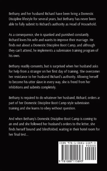 Bethany and her husband Richard have been living a Domestic Discipline lifestyle for several years, but Bethany has never been able to fully submit to Richard's authority as Head of Household. As a consequence, she is spanked and punished constantly. Richard loves his wife and wants to improve their marriage. He finds out about a Domestic Discipline Boot Camp, and although they can't attend, he implements a submission training program of his own. Bethany readily consents, but is surprised when her husband asks for help from a stranger on her first day of training. She overcomes her resistance to her husband Richard's authority. Allowing herself to become his utter slave in every way, she is freed from her inhibitions and submits completely. Bethany is required to do whatever her husband, Richard, orders as part of her Domestic Discipline Boot Camp style submission training and she learns to obey without question. And when Bethany's Domestic Discipline Boot Camp is coming to an end and she followed her husband's orders to the letter, she finds herself bound and blindfolded, waiting in their hotel room for her final test...* * * TAKE NOTE: This short read contain descriptions of hot, graphic, sexual situations and is intended for mature 18+ audiences. They include graphic descriptions of DOMESTIC DISCIPLINE, Public Sex Acts and Nudity, BARE BOTTOM OTK SPANKING with a wooden paddle, Bondage, Blindfolds, HOTWIFE and submissive wife. EXPLICIT SEX including Sex with a stranger, Oral Sex (M/F and F/F) and FIRST TIME ANAL SEX.