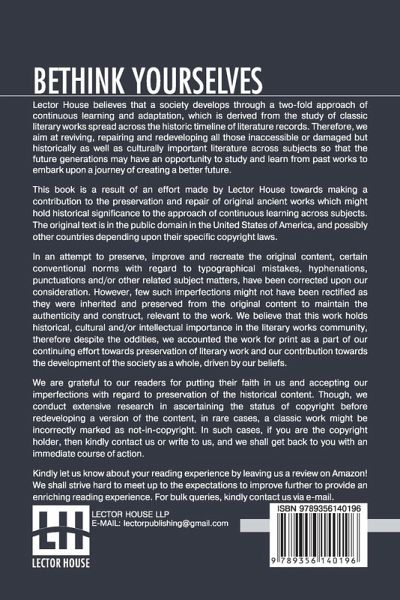 NEW PRINT WITH PROFESSIONAL TYPE-SET IN CONTRAST TO SCANNED PRINTS OFFERED BY OTHERS Bethink Yourselves: Concerning The Russo-Japanese War Translated By Aylmer Maude This book is a result of an effort made by us towards making a contribution to the preservation and repair of original classic literature. In an attempt to preserve, improve and recreate the original content, we have worked towards: 1. Type-setting & Reformatting: The complete work has been re-designed via professional layout, formatting and type-setting tools to re-create the same edition with rich typography, graphics, high quality images, and table elements, giving our readers the feel of holding a 'fresh and newly' reprinted and/or revised edition, as opposed to other scanned & printed (Optical Character Recognition - OCR) reproductions. 2. Correction of imperfections: As the work was re-created from the scratch, therefore, it was vetted to rectify certain conventional norms with regard to typographical mistakes, hyphenations, punctuations, blurred images, missing content/pages, and/or other related subject matters, upon our consideration. Every attempt was made to rectify the imperfections related to omitted constructs in the original edition via other references. However, a few of such imperfections which could not be rectified due to intentional\unintentional omission of content in the original edition, were inherited and preserved from the original work to maintain the authenticity and construct, relevant to the work. We believe that this work holds historical, cultural and/or intellectual importance in the literary works community, therefore despite the oddities, we accounted the work for print as a part of our continuing effort towards preservation of literary work and our contribution towards the development of the society as a whole, driven by our beliefs. We are grateful to our readers for putting their faith in us and accepting our imperfections with regard to preservation of the historical content. HAPPY READING!